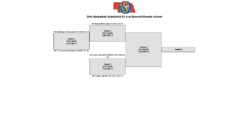 #5 TCNE will play #4 Hartington-Newcastle on Monday, February 16th at 6:30 p.m. at Bancroft-Rosalie High School.