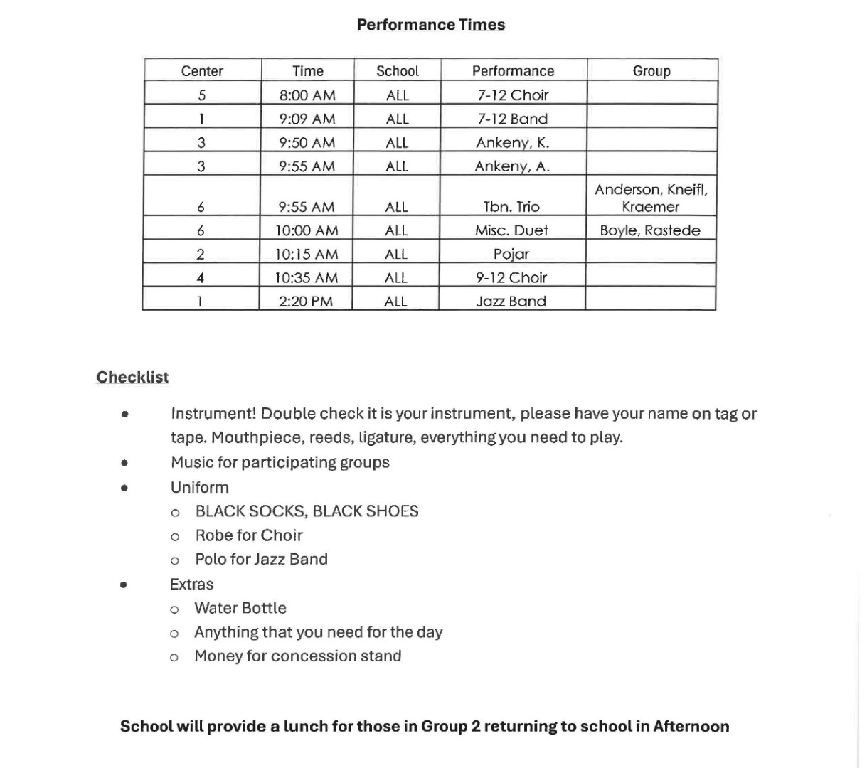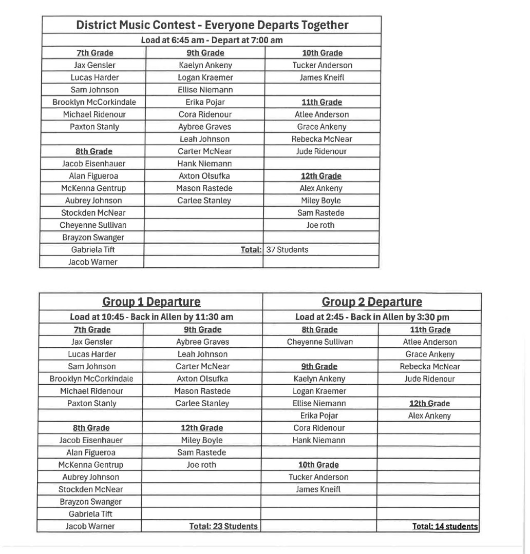 District Music Performance Schedule for Friday, April 24